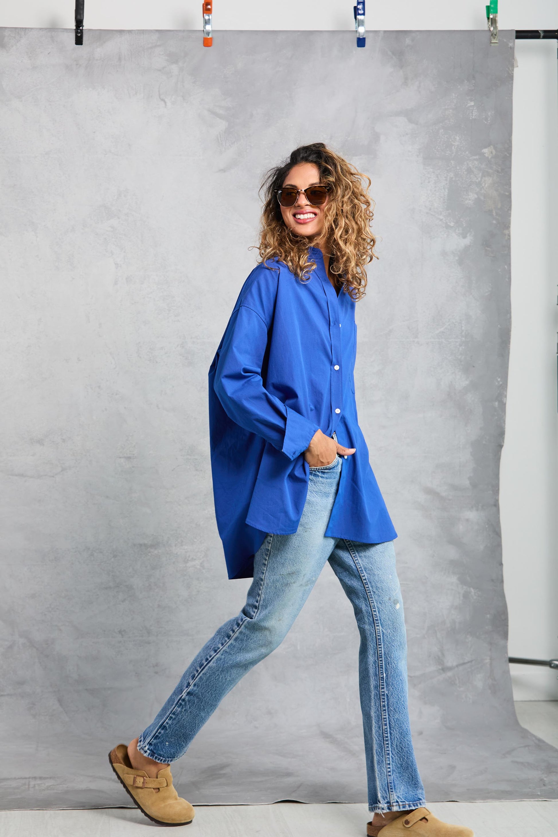 Classic collar shirt with a twist, button detail in front for wrap styling. Wear it unbuttoned for an oversized effortless look.