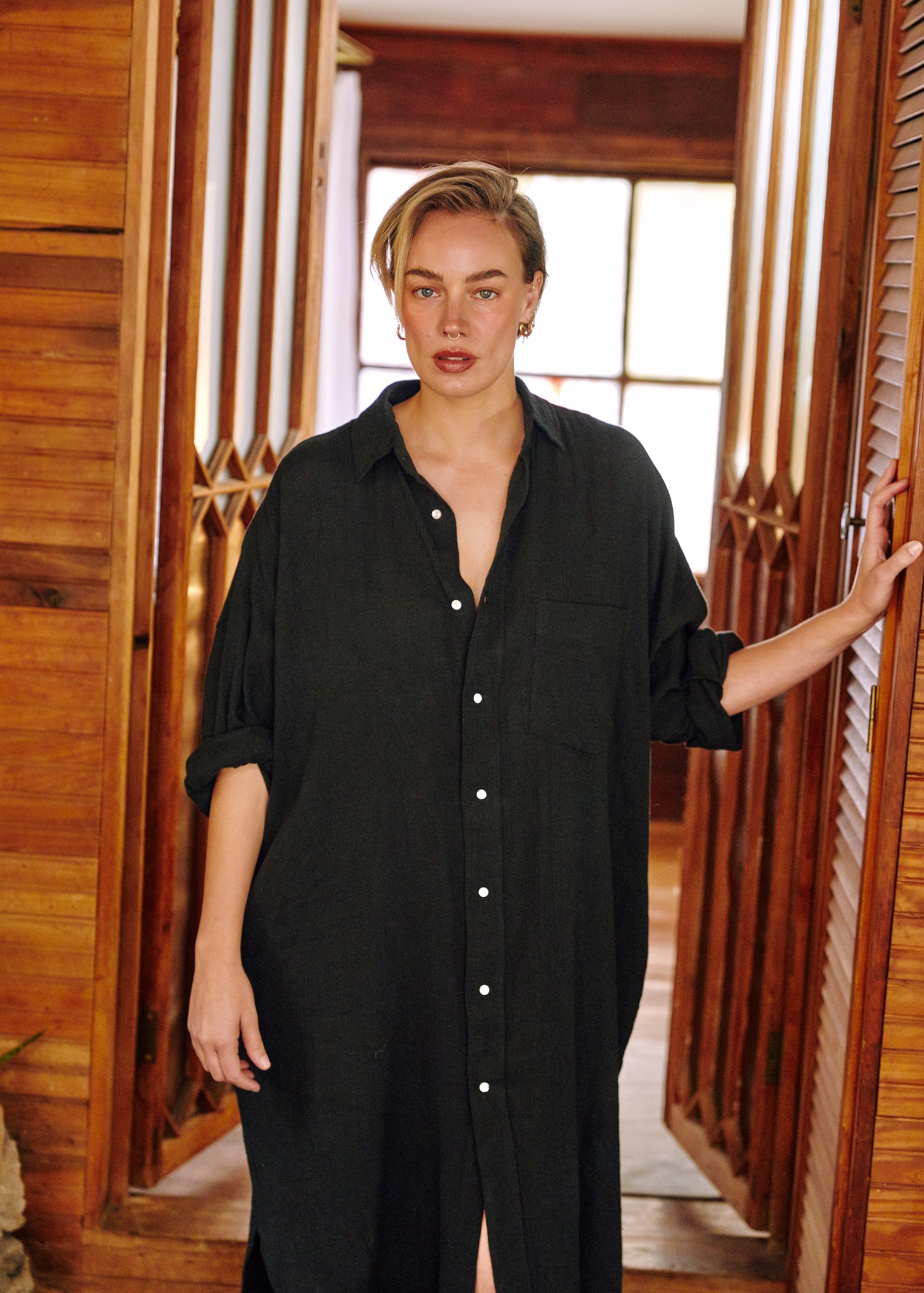 Classic Shirt Dress for everyday ease. Button-down oversized silhouette with side slits, front + side pockets. Our hero style continues in a staple Black colour.