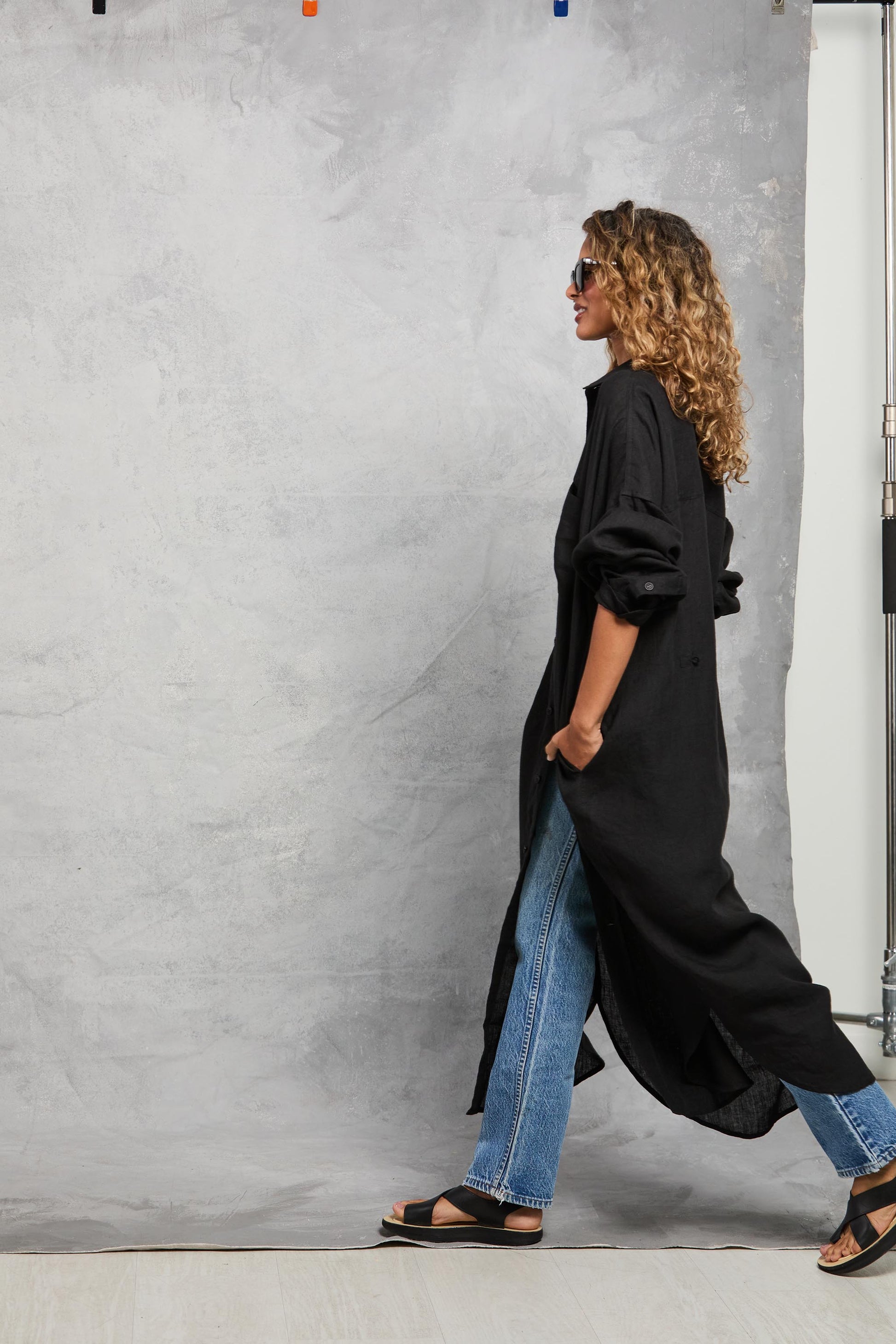 Classic Shirt Dress for everyday ease. Button-down oversized silhouette with side slits, front + side pockets. Our hero style continues in a staple Black colour.