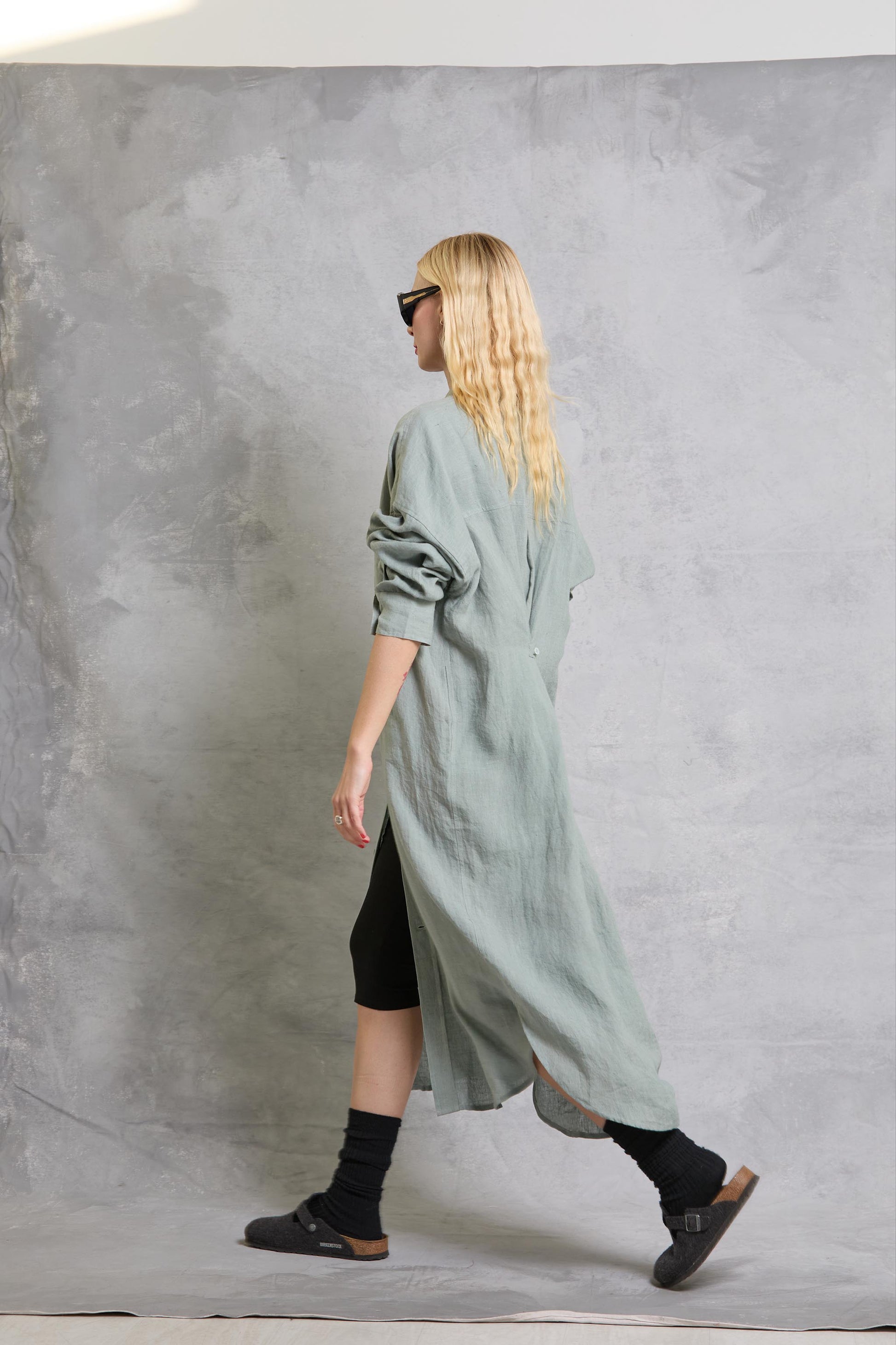 Classic Shirt Dress for everyday ease. Button-down oversized silhouette with side slits, front + side pockets. Our hero style has been updated with a button and loop in back for a waist cinch styling.