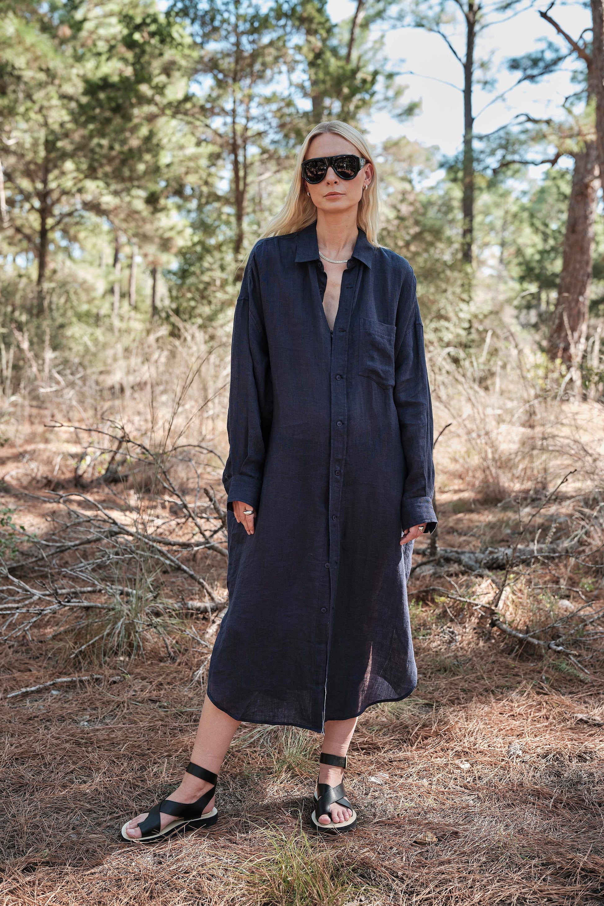 Classic Shirt Dress for everyday ease. Button-down oversized silhouette with side slits, front + side pockets. Our hero style has been updated with a button and loop in back for a waist cinch styling.