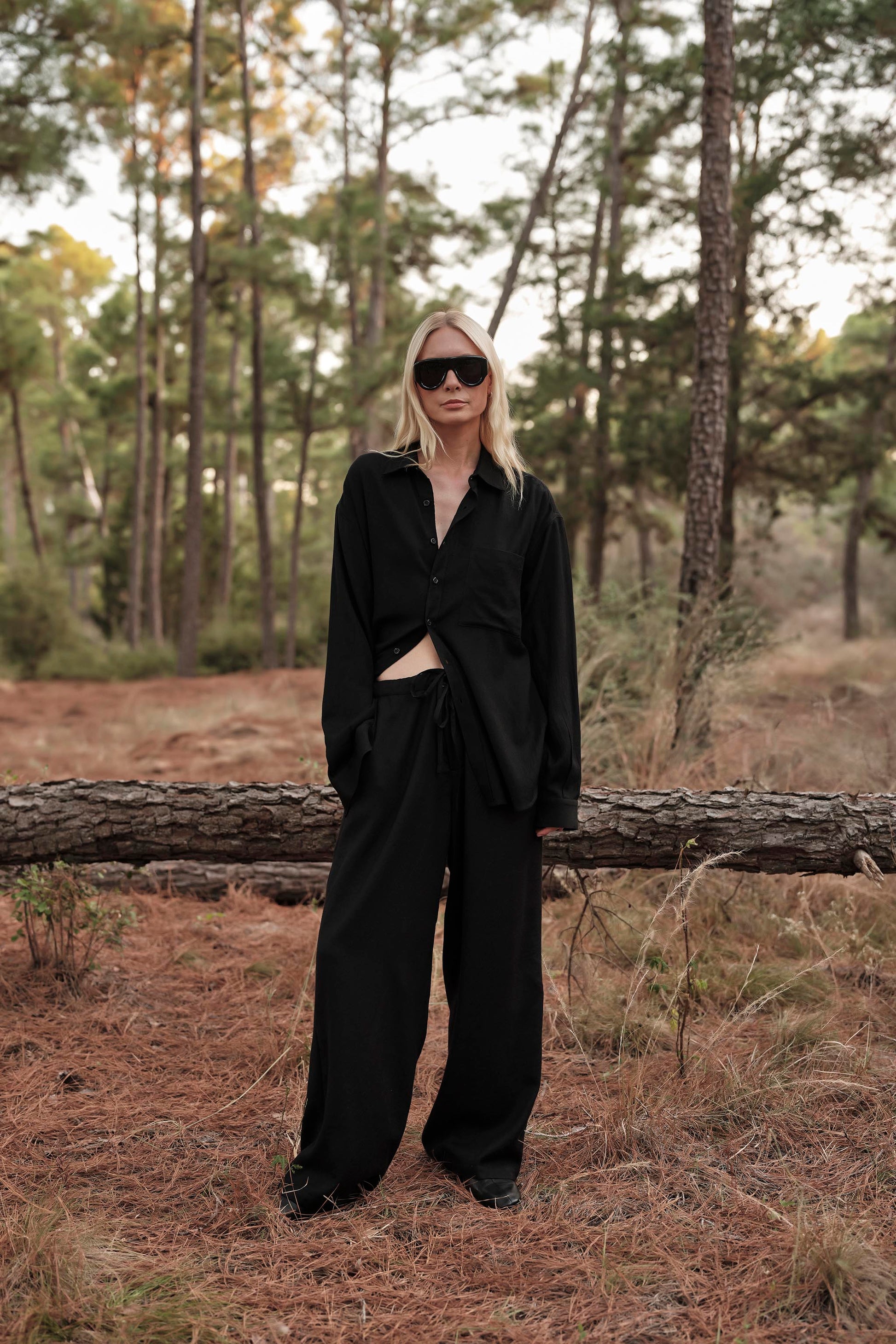 Relaxed cozy pant in a delicate light-weight wool with a soft hand. Straight leg shape with button front fly, drawstring waist, side pockets.