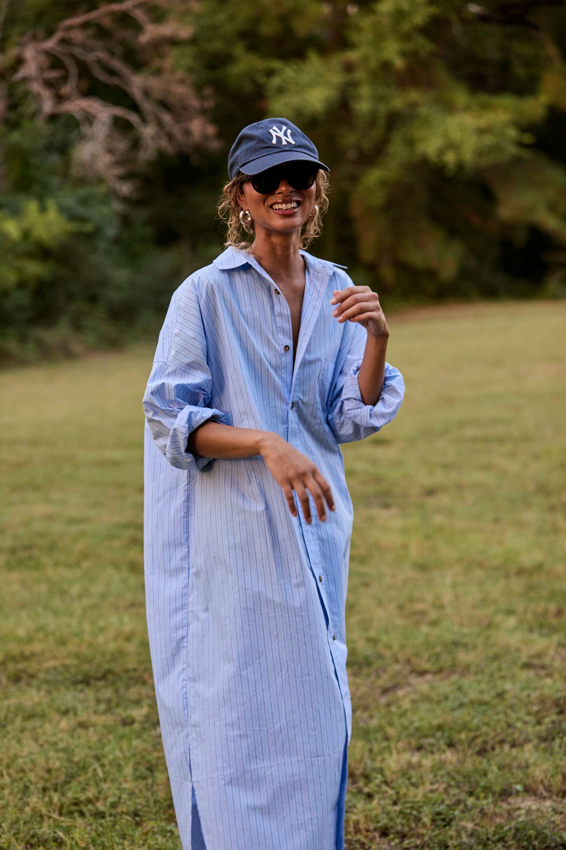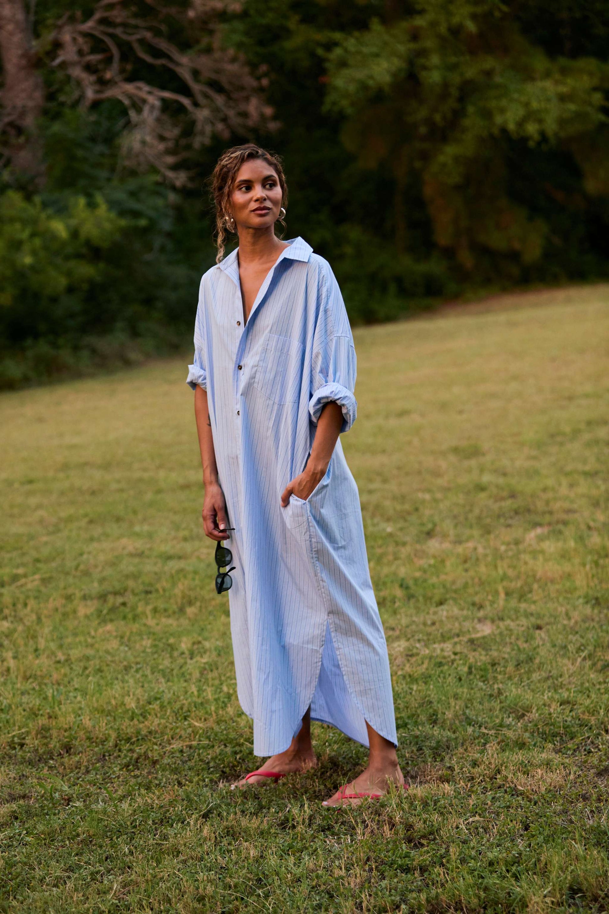 Oversized, Everyday shirtdress in crisp poplin with light blue and tonal stripes. Button-down, ankle-length with side slits, front and side pockets.
