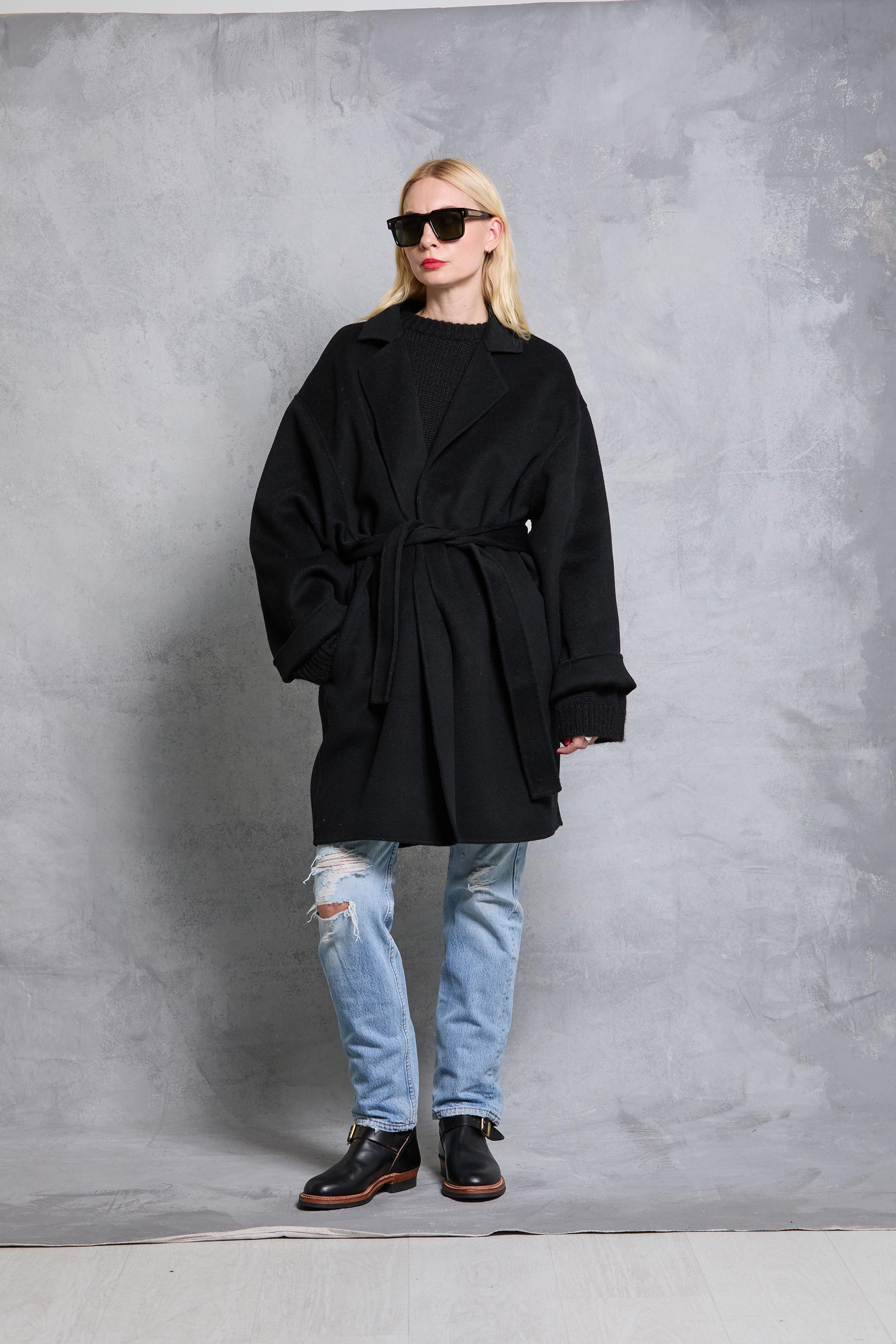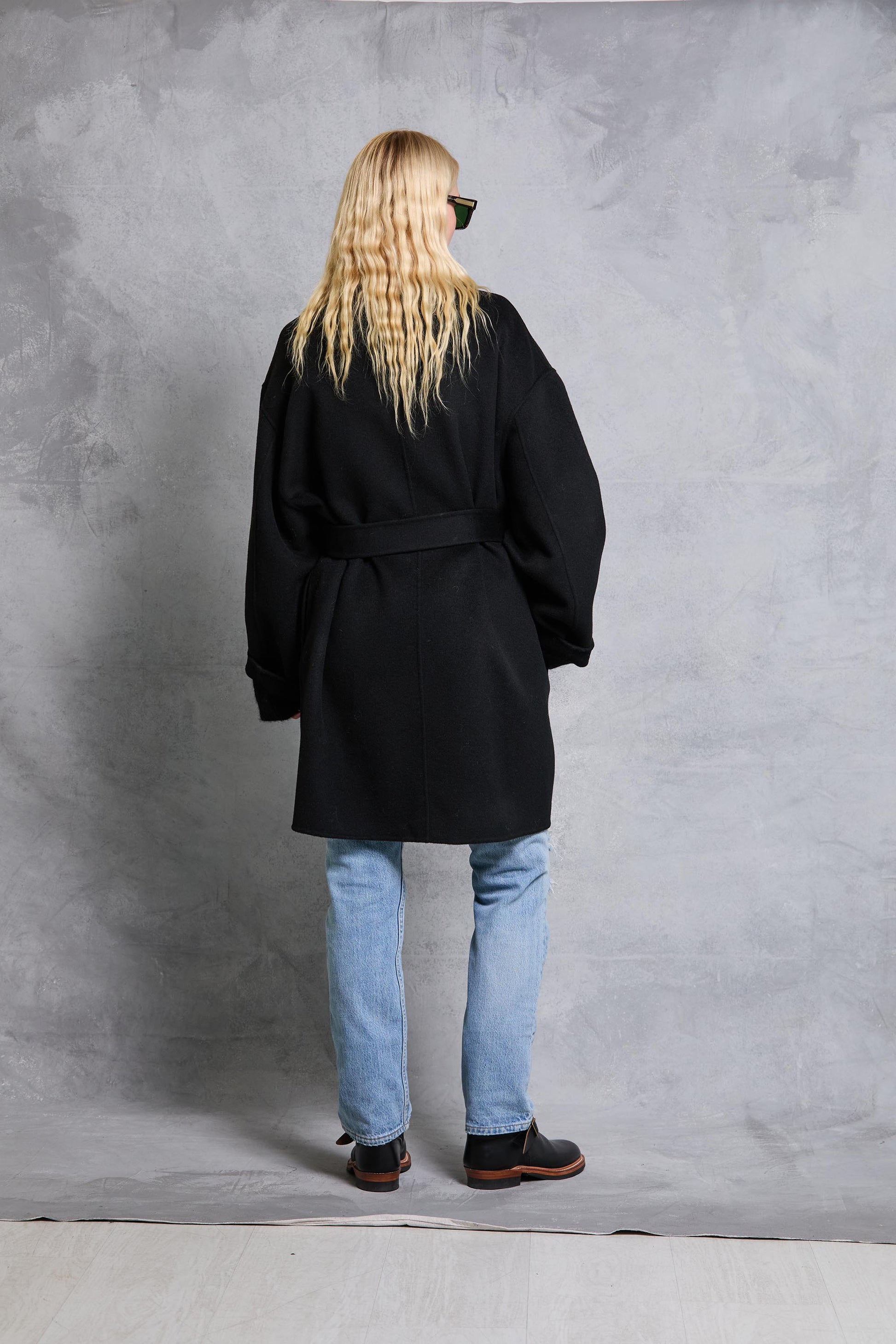 Cocoon style coat with polished details and a removable belt. Easy shape, notched collar, side pockets and removable belt. Layer over anything for instant elegance.