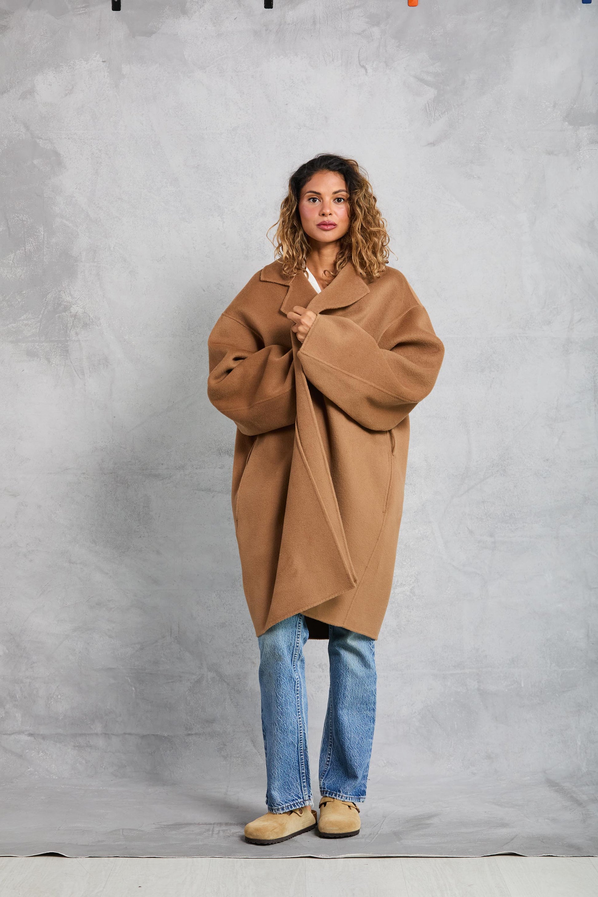 Cocoon style coat with polished details and removable belt. Easy shape, notched collar, side pockets and removable belt. Layer over anything for instant elegance.