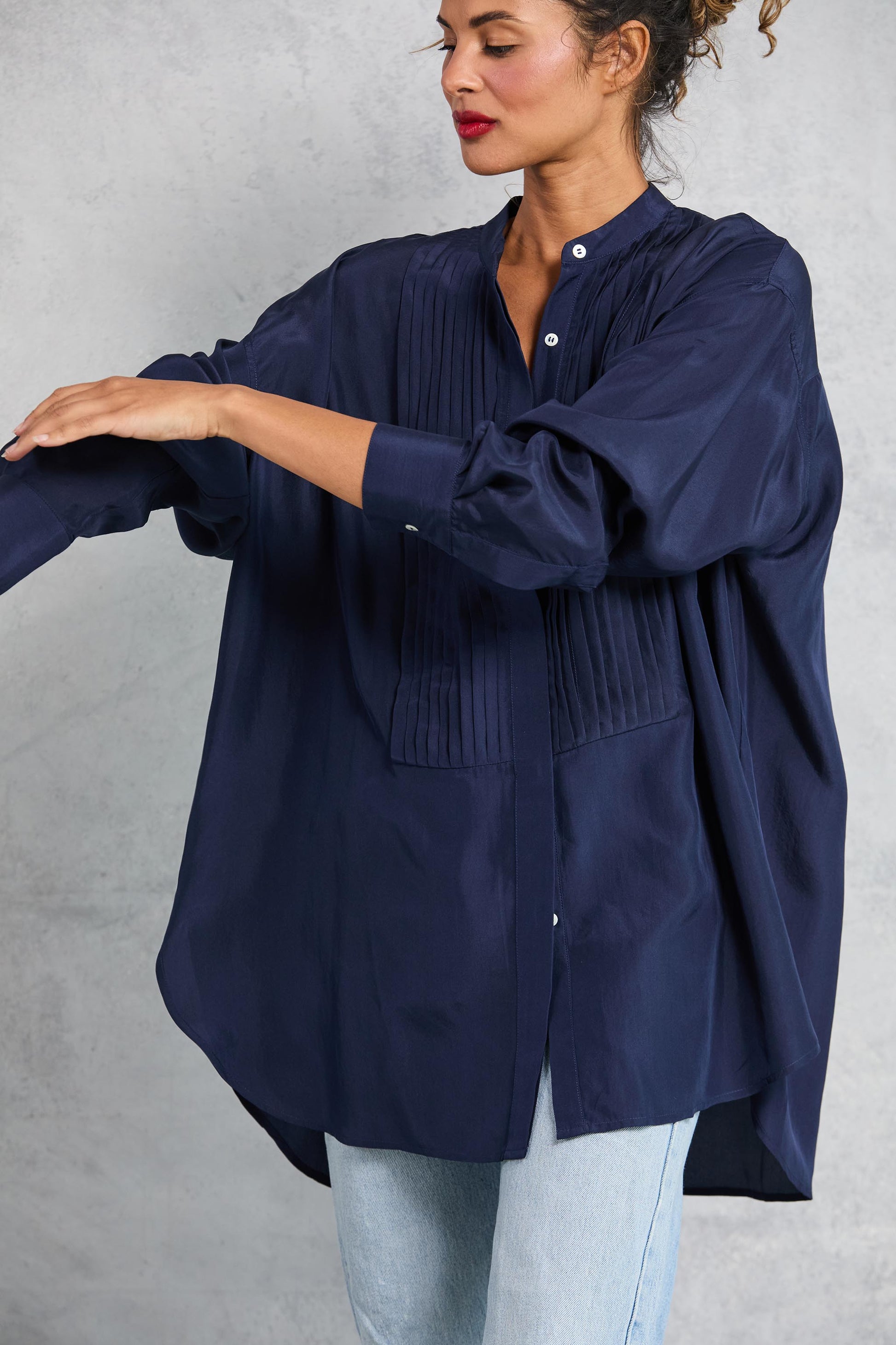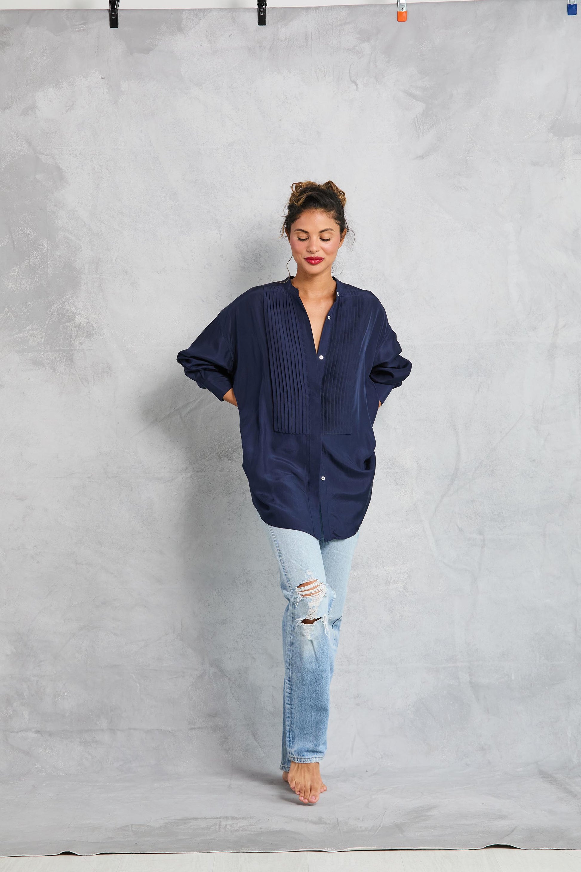 Classic dress shirt with a tuxedo details and styling. Hand-pleated silk yoke with hidden button placket. A staple piece that lifts any casual look instantly.