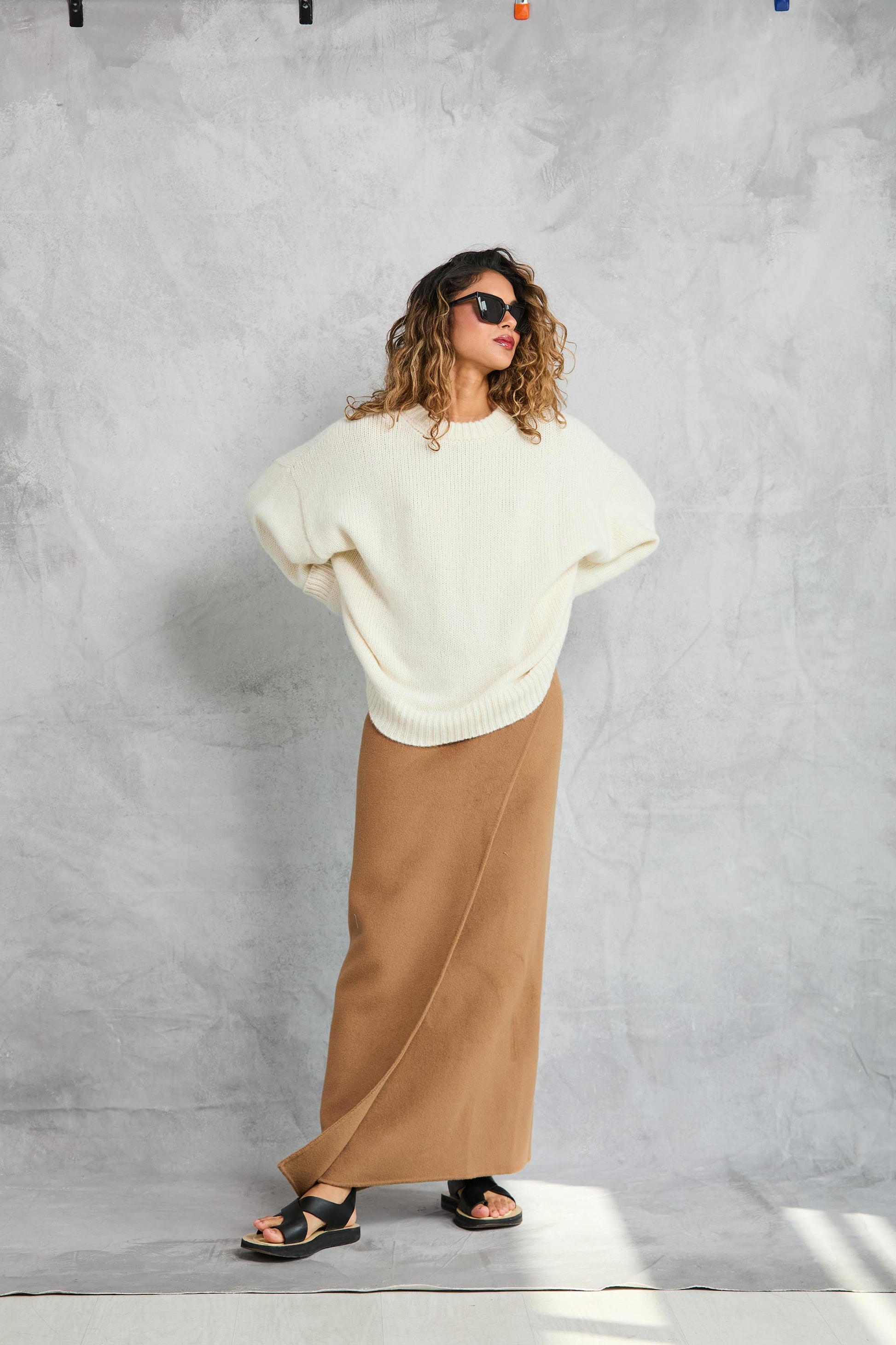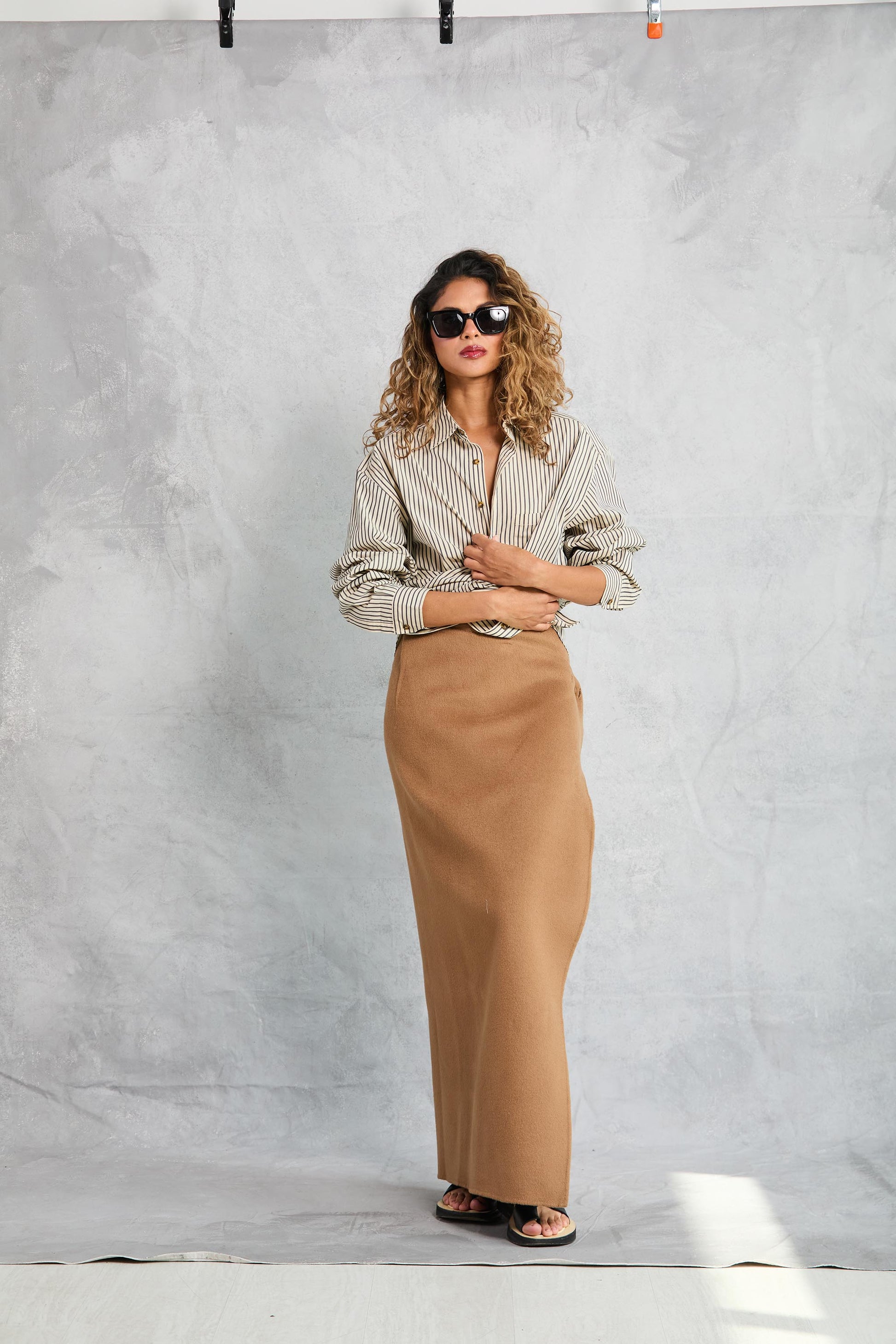 Cozy Wrap Skirt with adjustable inside tie and outer button closure. A simple heirloom style skirt to pair and lift any look.
